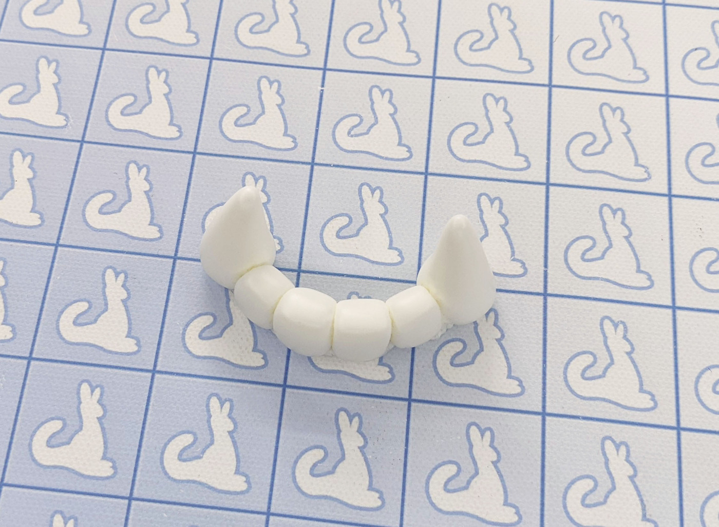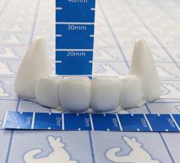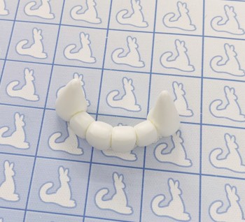 These teeth are made of a clear epoxy resin that's tinted to your choice of color. The underside is made rough to be easily adhered to most surfaces and materials.